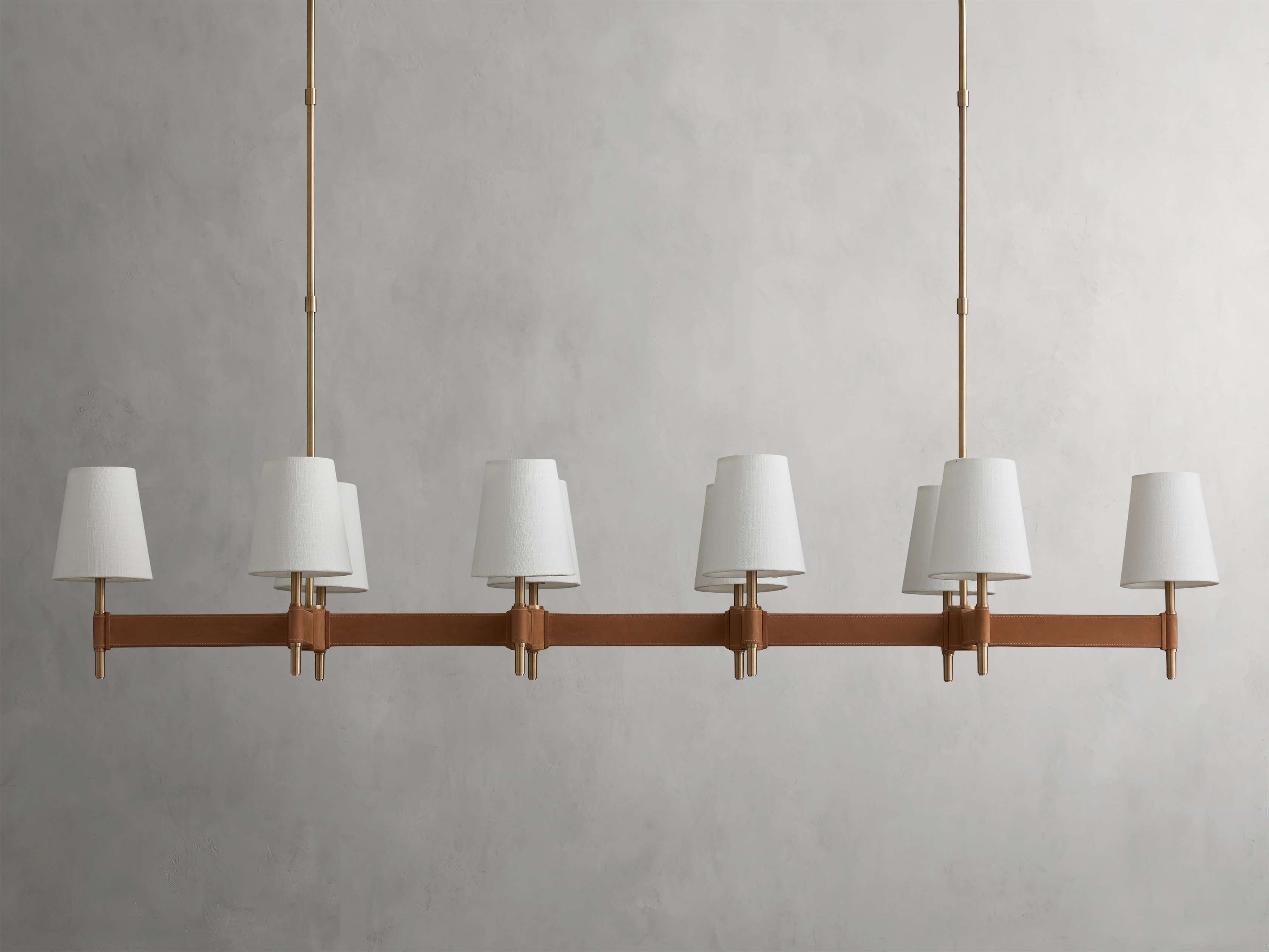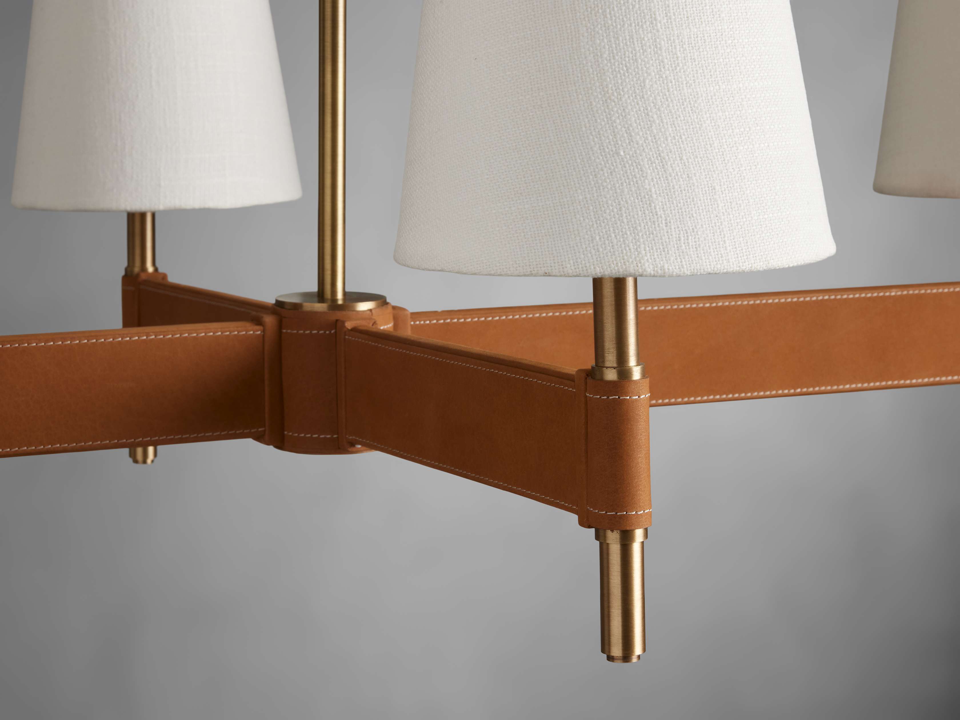 Iconic midcentury modern design and a juxtaposition of mixed materials inspire our Hastings Lighting Collection. Bases crafted from brass with an antiqued finish are complemented by tan leather stitched details and white linen shades to bring thoughtful elegance to any space.