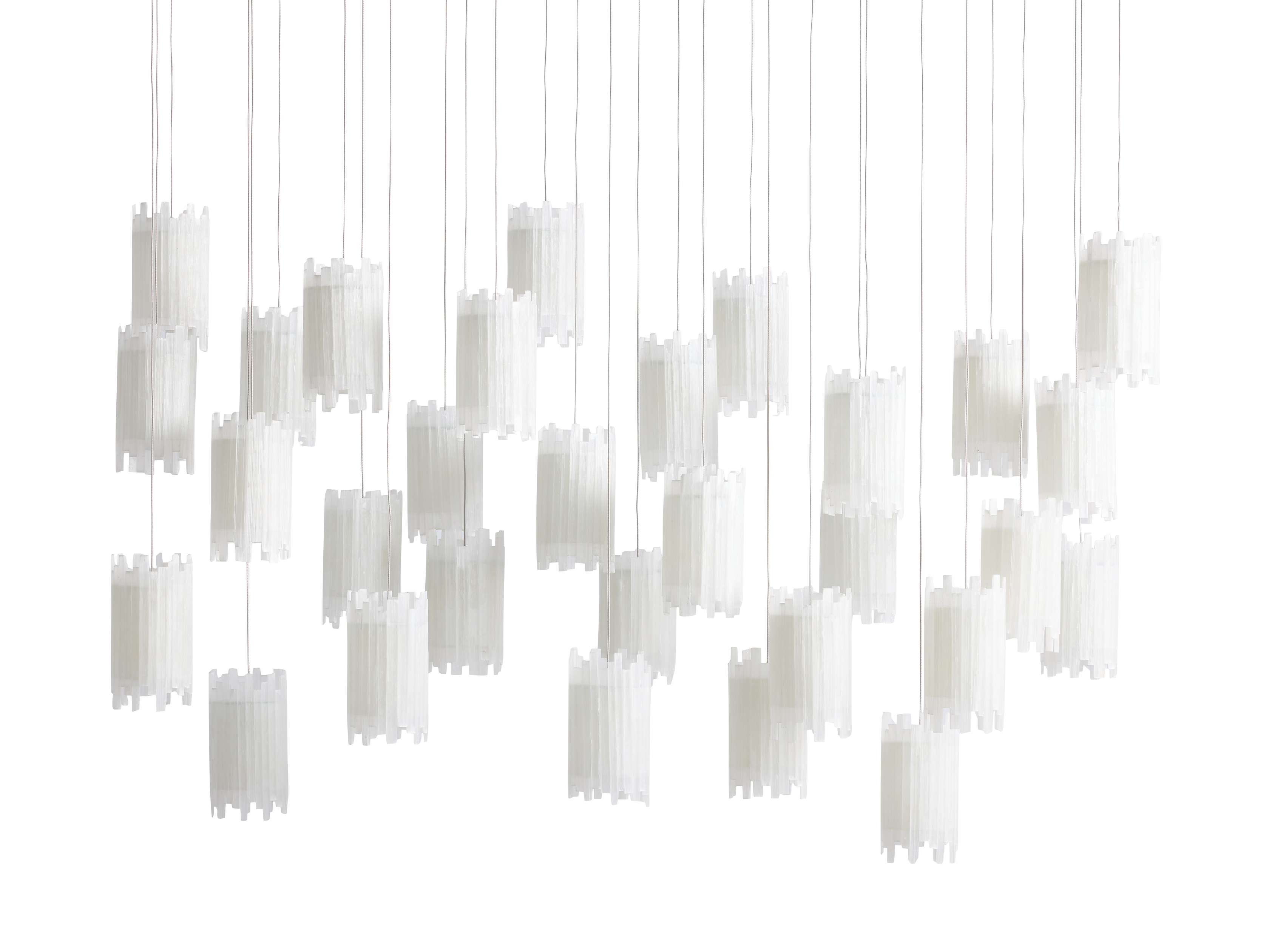 Capture the beauty of falling stars casting a stunning glow in your home with our Gianna Chandelier. Featuring thin, adjustable PVC cables that are customizable to your space, each drop juxtaposes industrial materials with exquisite natural selenite stone shades. When illuminated, the drops appear to be floating in midair—creating a unique and elevated statement in any room.