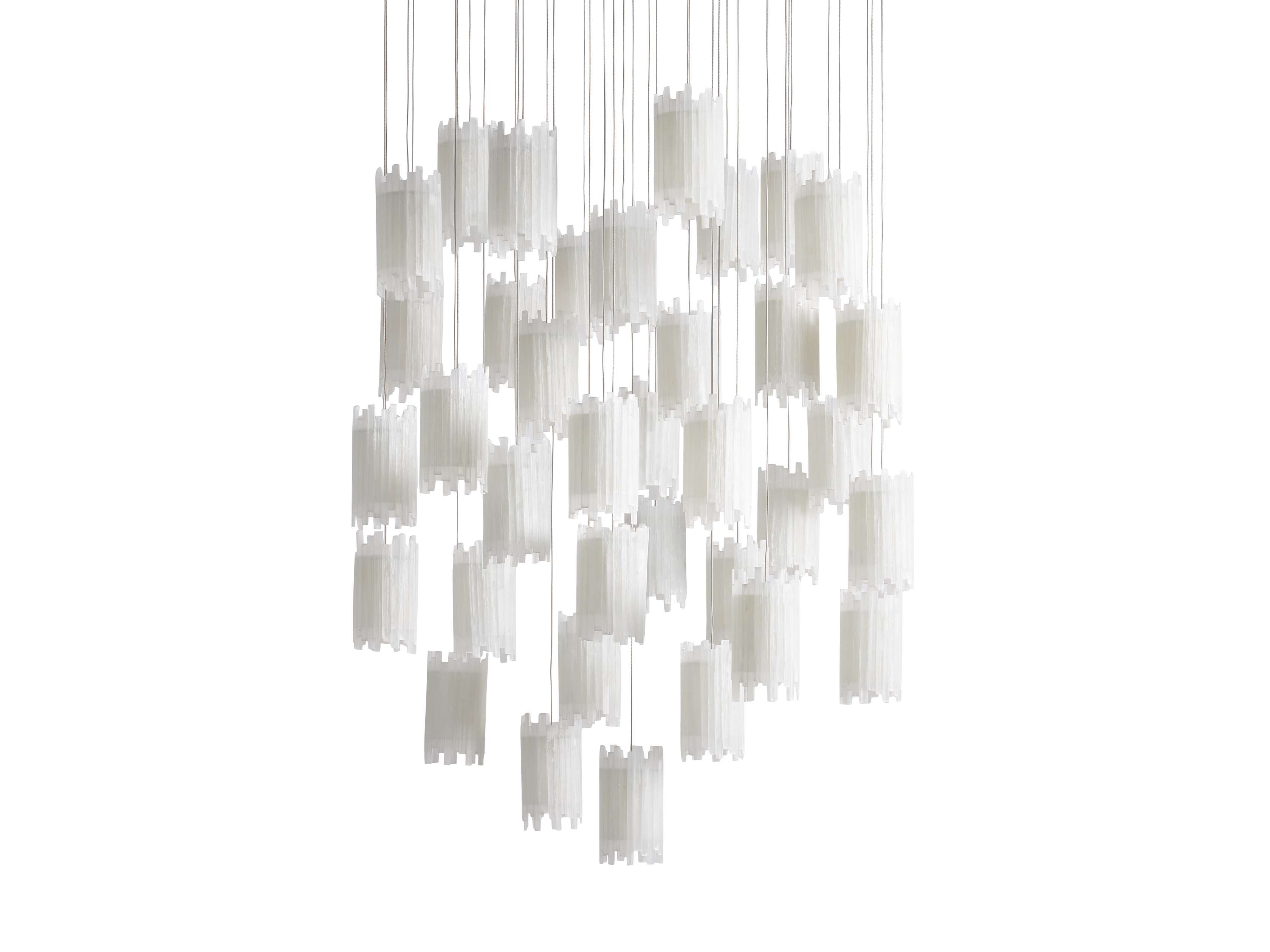 - Made from PVC cables featuring a silver finish with a clear protective lacquer and complemented by pendant shades crafted from natural selenite stone.