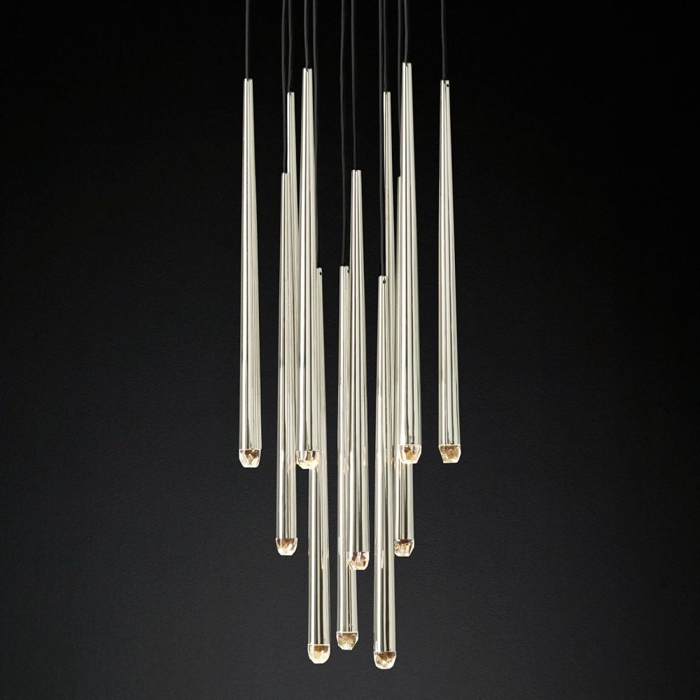 The Aquitaine Collection explores minimalist French design through suspended geometric forms and precise proportions. Faceted glass tips glow softly from slender cords, capturing a quiet balance of light and structure.
