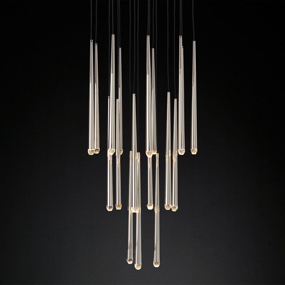 The Aquitaine Collection explores minimalist French design through suspended geometric forms and precise proportions. Faceted glass tips glow softly from slender cords, capturing a quiet balance of light and structure.