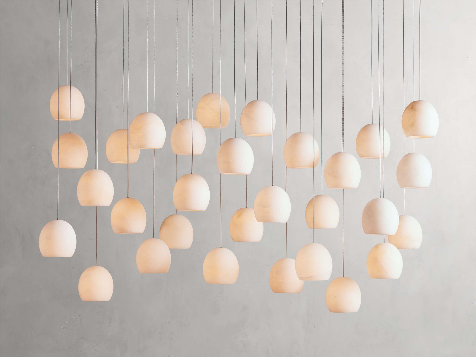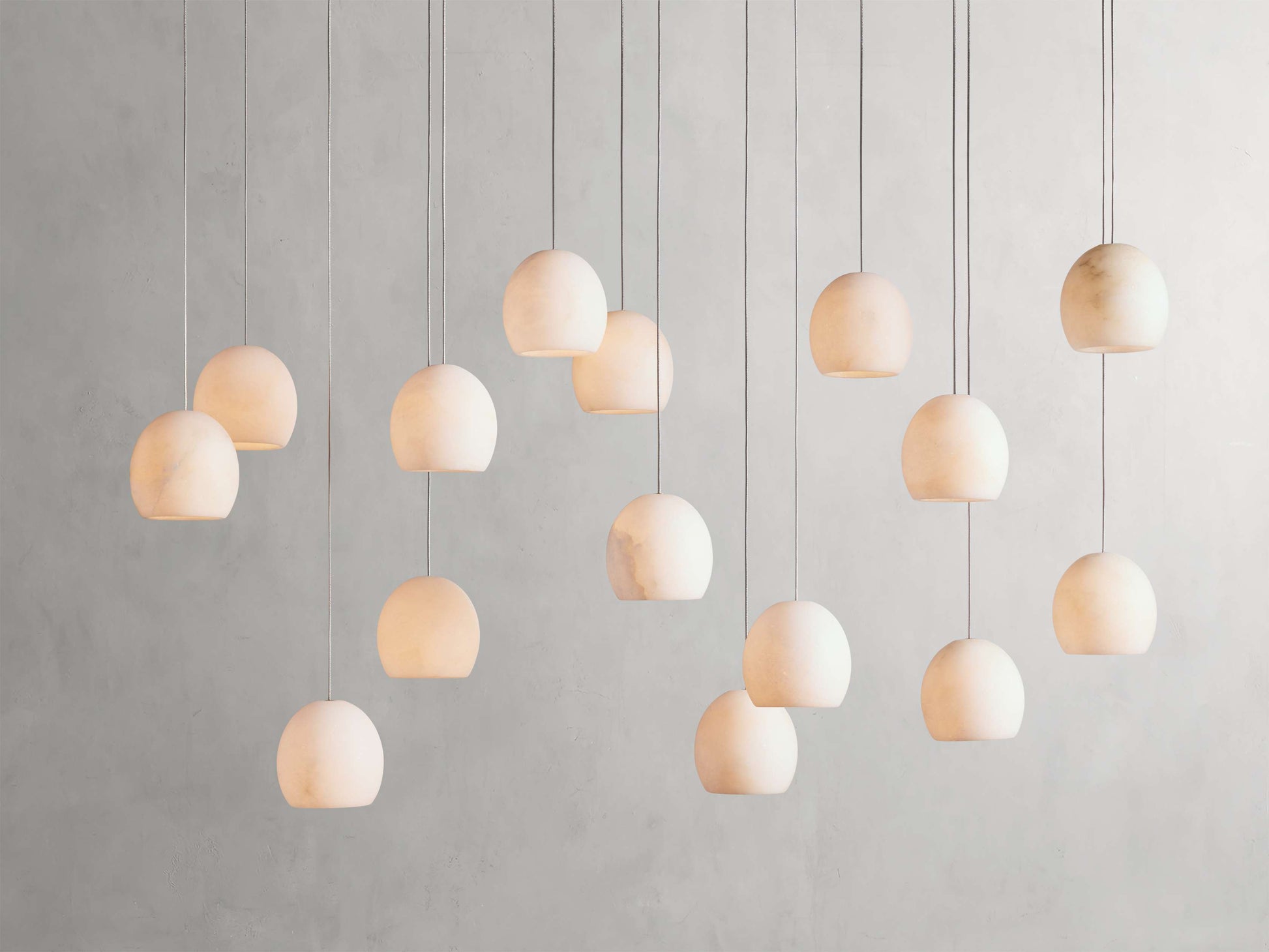 Featuring an adjustable cable cascading into a curved shade made from natural alabaster stone, our Arica Collection adds a touch of organic elegance. Designed to highlight the beautiful variations found in natural alabaster, each luminous shade showcases delicate swirls of unique veining making each pendant truly one-of-a-kind.