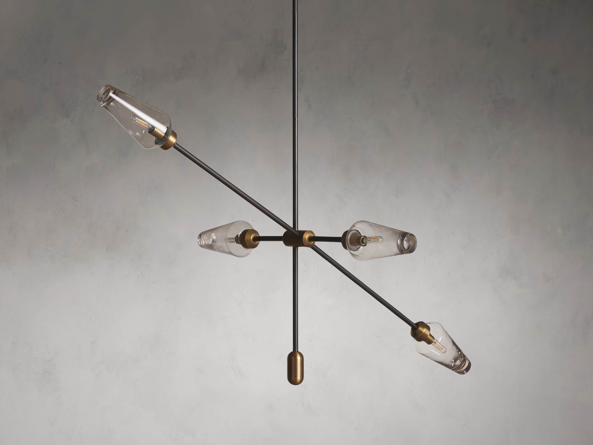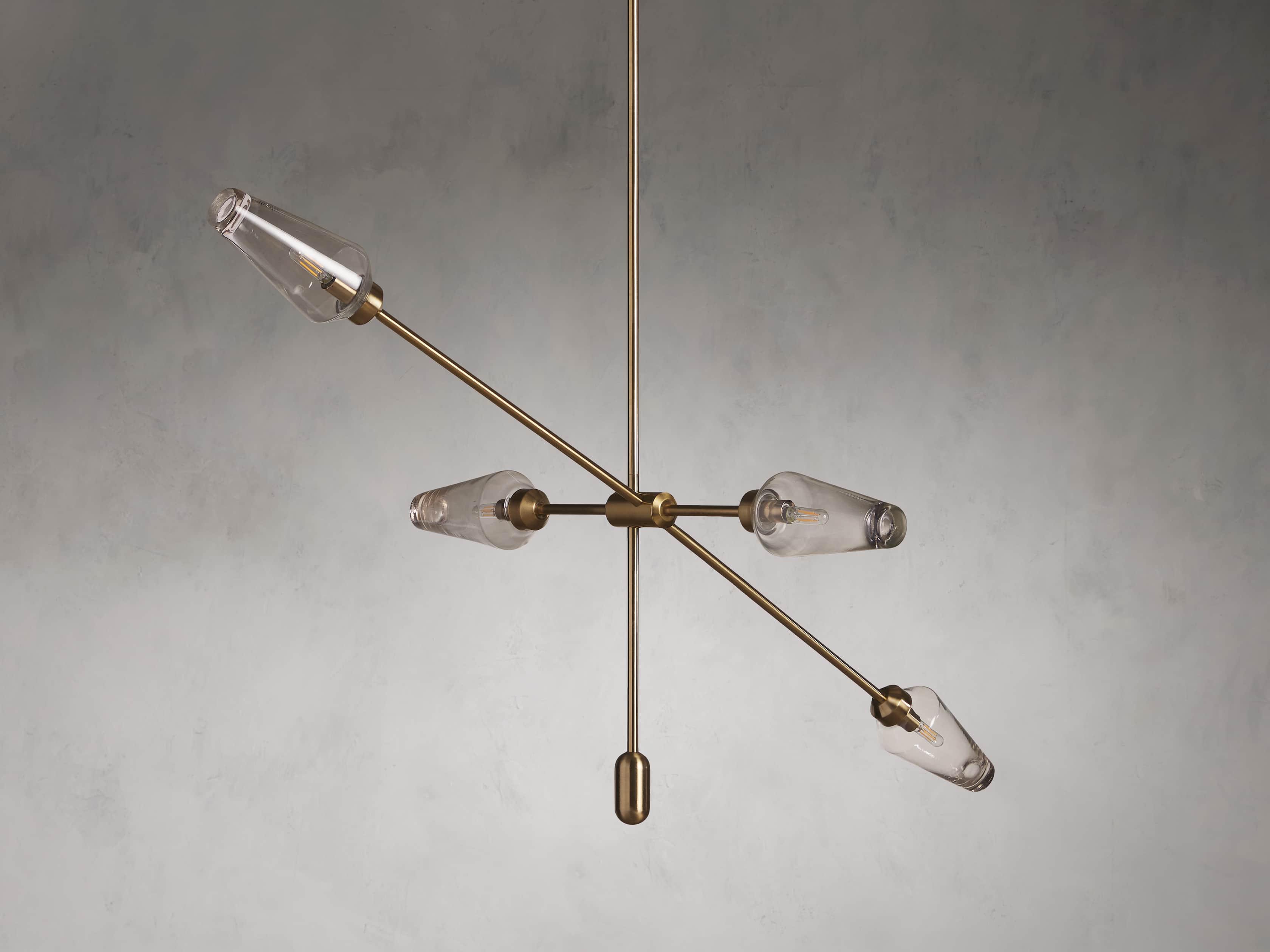 With dense, mouth-blown glass living harmoniously with burnished-brass accents, the striking silhouette of our Arrow Brass Chandelier creates a perfectly asymmetrical yet linear design.