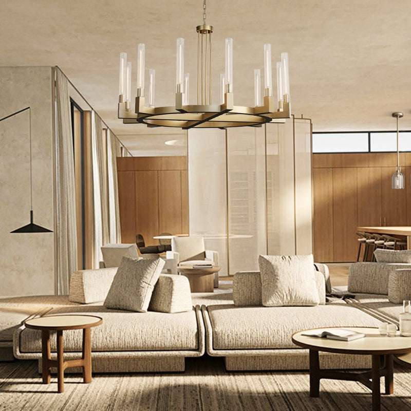 The Cannele Collection reinterprets Beaux Arts elegance through a solid brass frame and ribbed glass hurricanes. Its clean lines and vintage Edison bulbs cast a warm, inviting glow, blending classic craftsmanship with refined design.