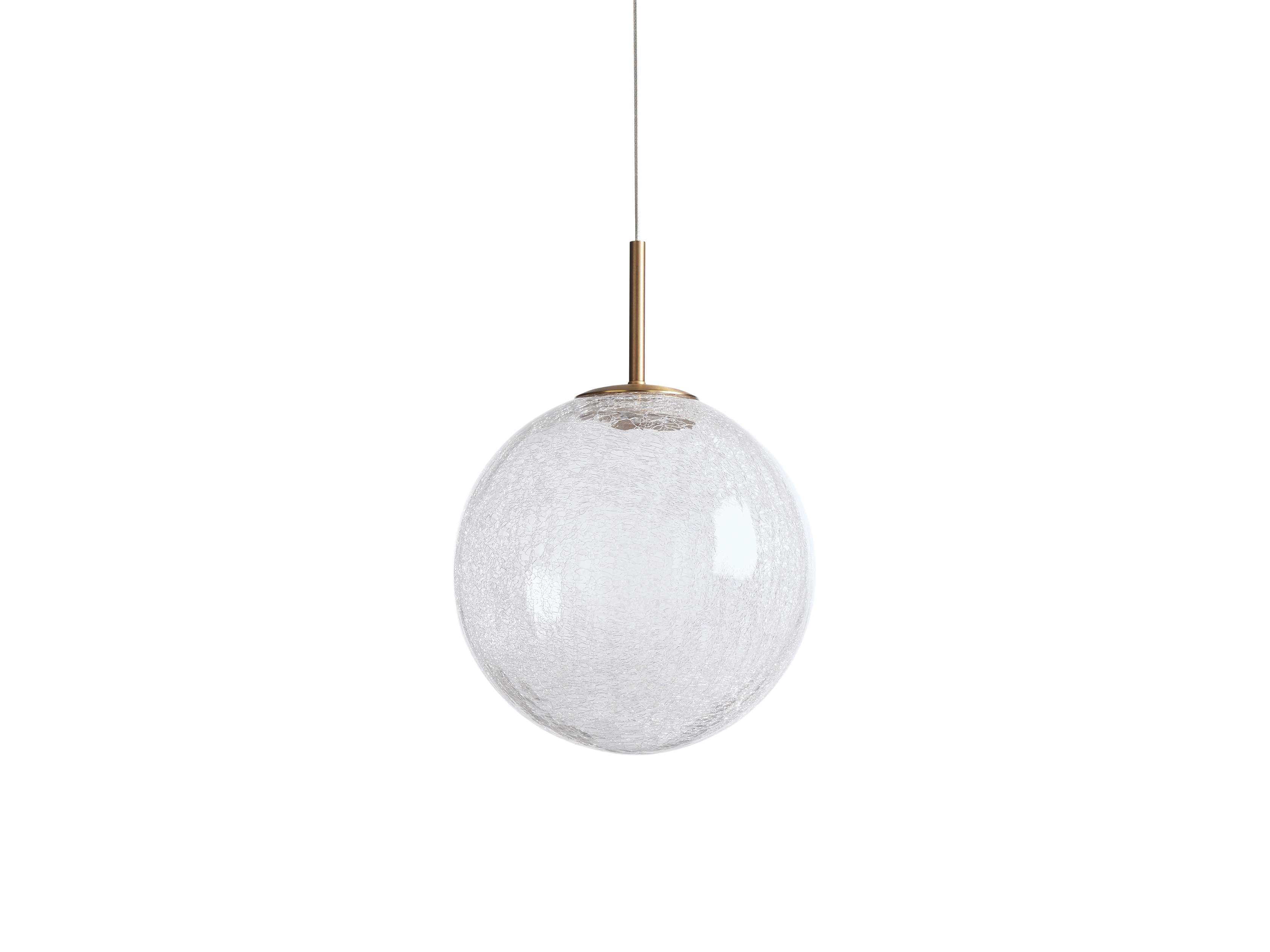 - Crafted from stainless steel with a satin brass finish and a mouth blown solid opal glass globe or crackle glass globe.