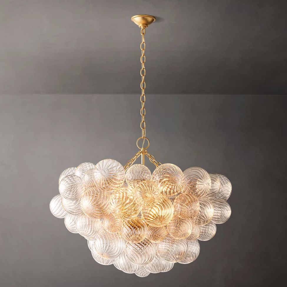 The Dorian collection features clusters of swirled glass orbs that appear weightless, floating around steel frames. Each orb reflects ripples of light through its textured surface, creating sculptural modern statement pieces with effortless elegance.