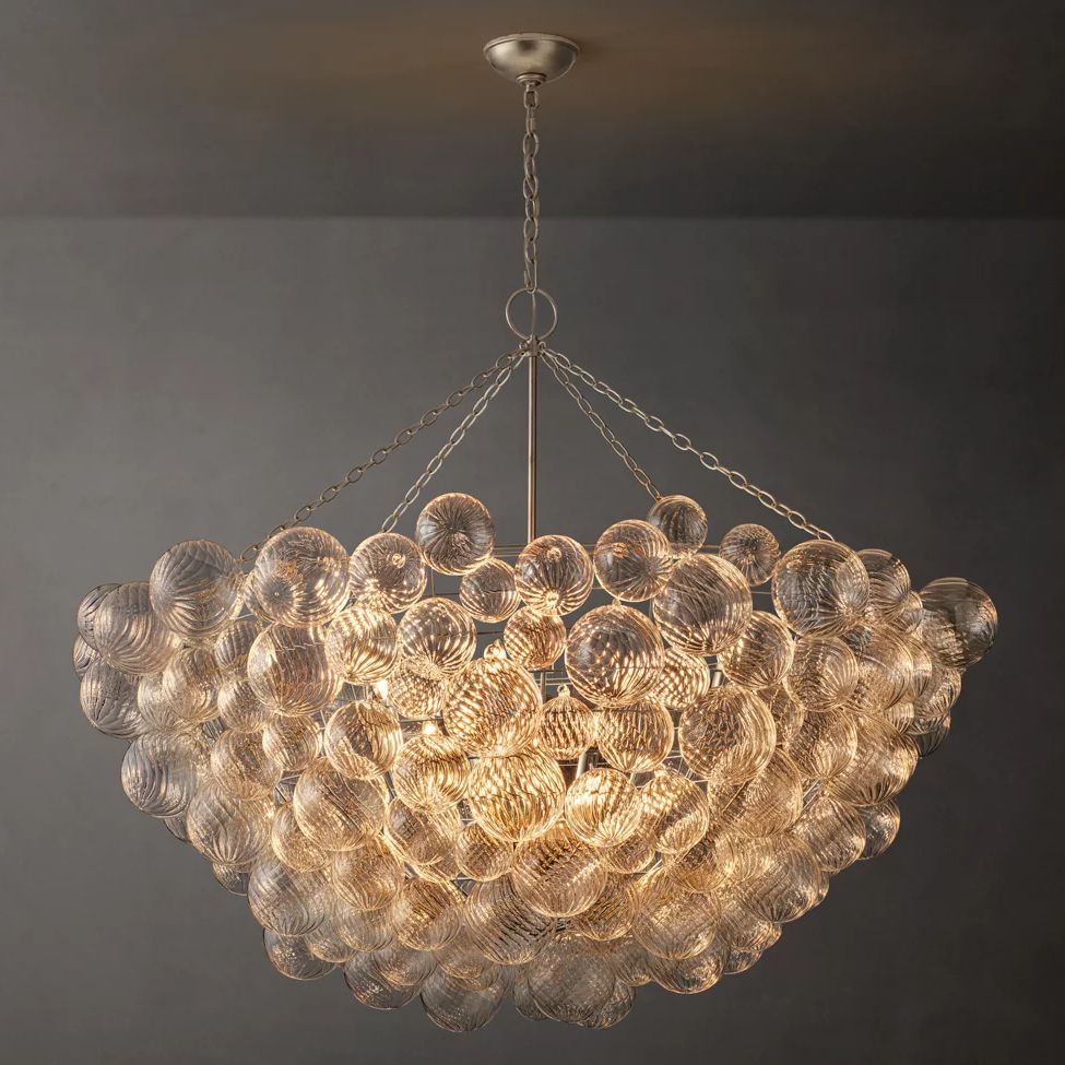 The Dorian collection features clusters of swirled glass orbs that appear weightless, floating around steel frames. Each orb reflects ripples of light through its textured surface, creating sculptural modern statement pieces with effortless elegance.