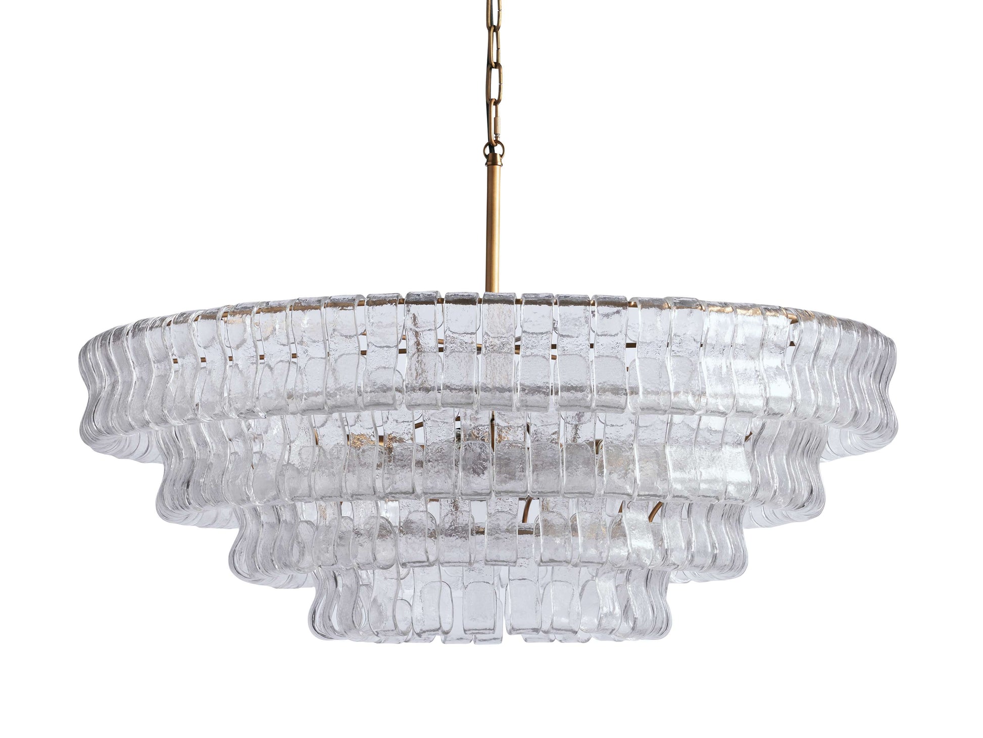 Inspired by renowned Italian glass, our Ghiaccio Collection features chandeliers that artfully diffuse light through curved, textured glass pieces. Complemented by a plated-brass finish, Ghiaccio elegantly illuminates any room.