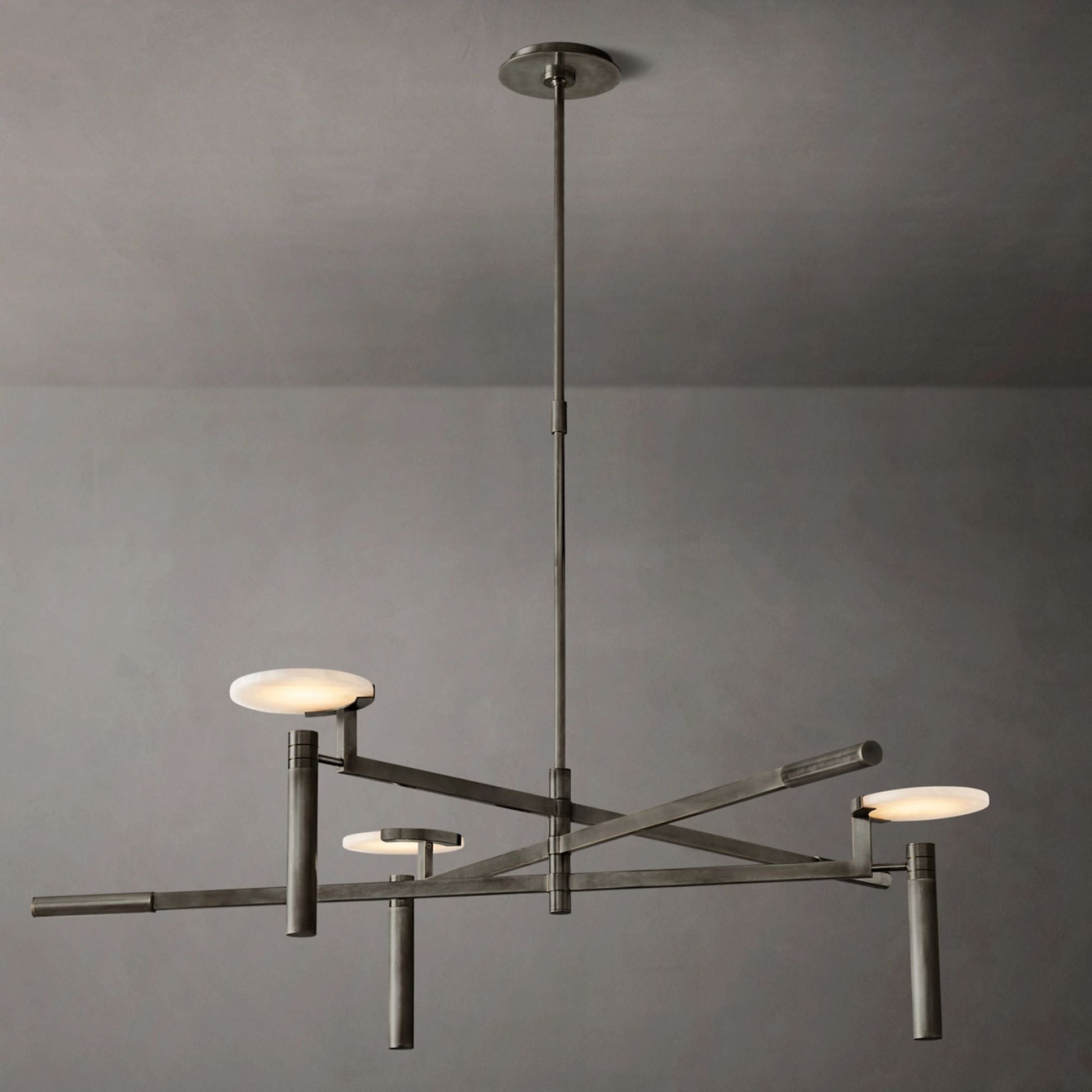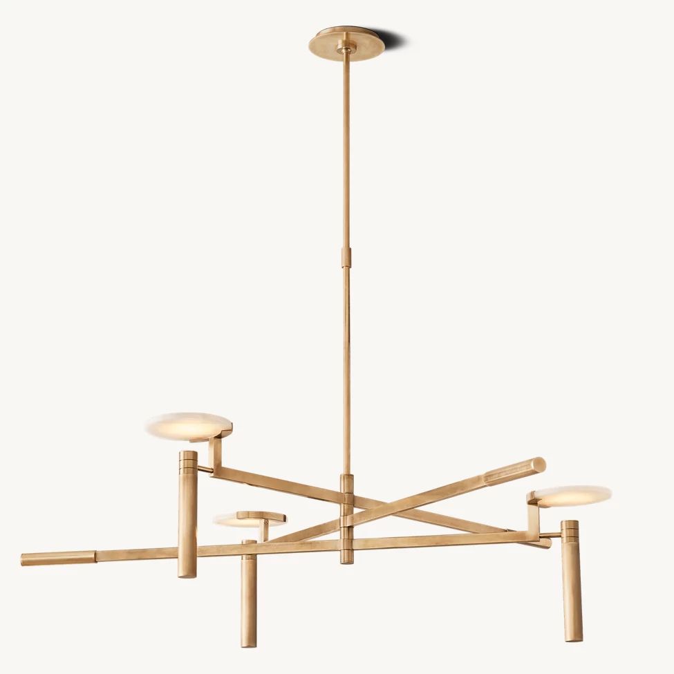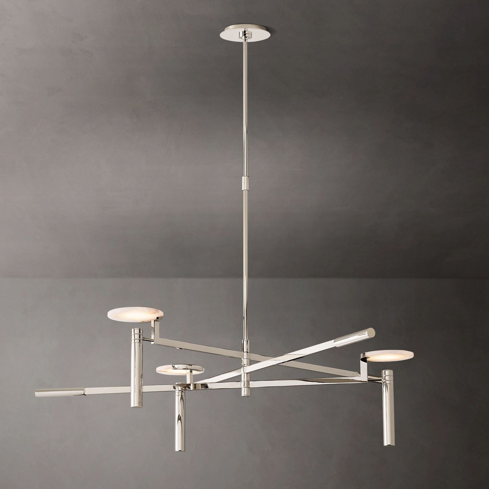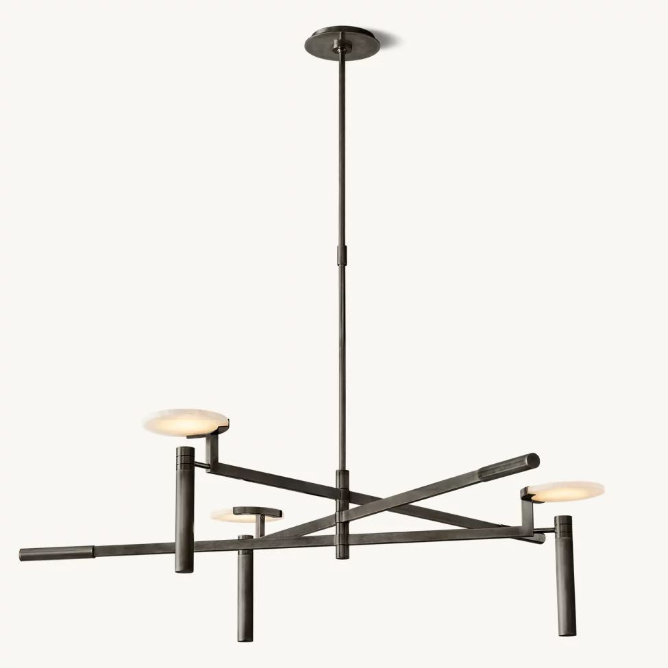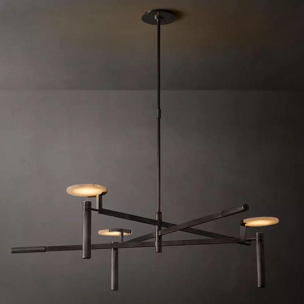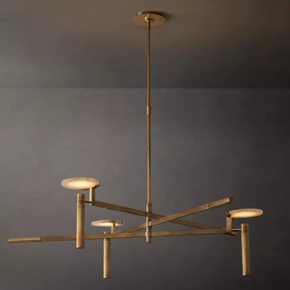 The Halver Collection highlights the elegance of midcentury Italian design through half-dome alabaster shades paired with slender metal rods. Each pendant emits a warm, diffused glow, revealing the stone's natural veining and refined textural depth.