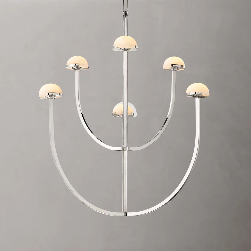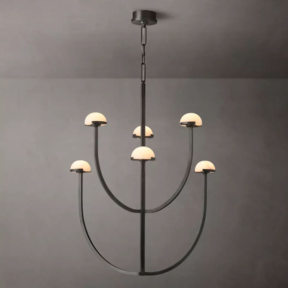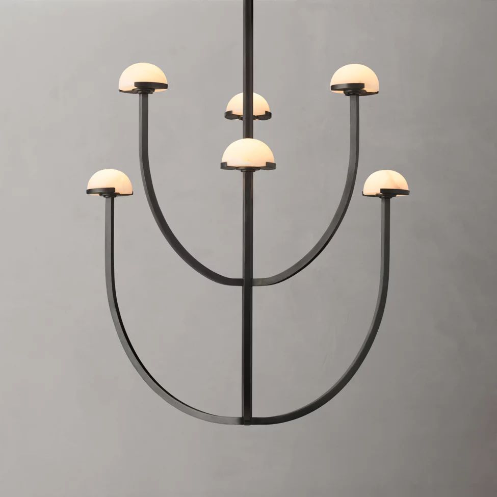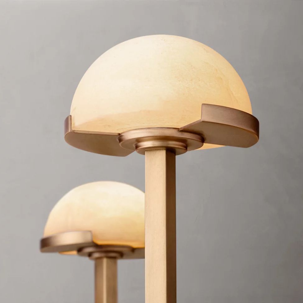 The Perael Collection showcases sculptural metal geometry supporting translucent alabaster hemispheres, shaping a refined interplay of form and filtered light while revealing the stone’s organic veining and a warm, atmospheric glow.
