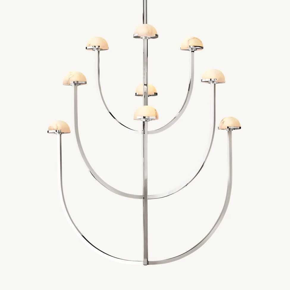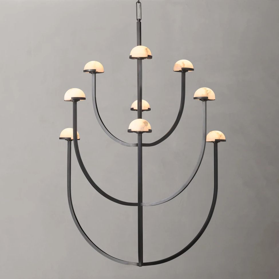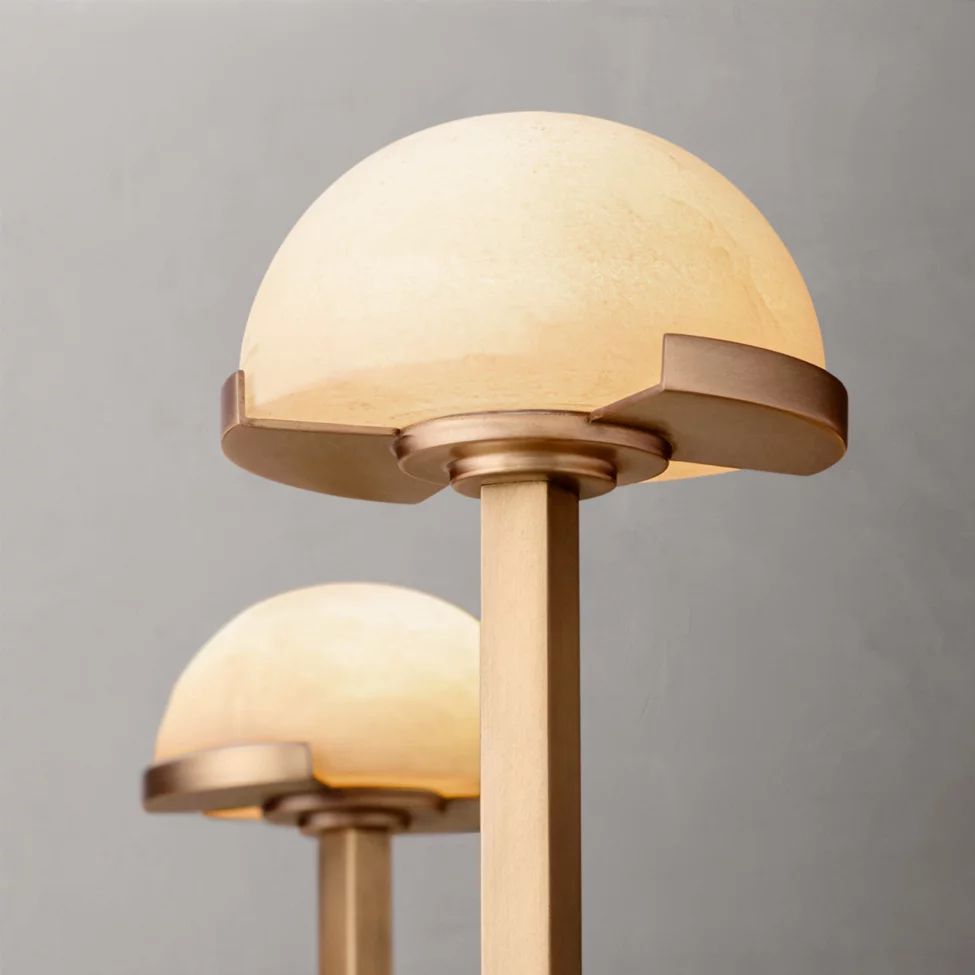 The Perael Collection showcases sculptural metal geometry supporting translucent alabaster hemispheres, shaping a refined interplay of form and filtered light while revealing the stone’s organic veining and a warm, atmospheric glow.