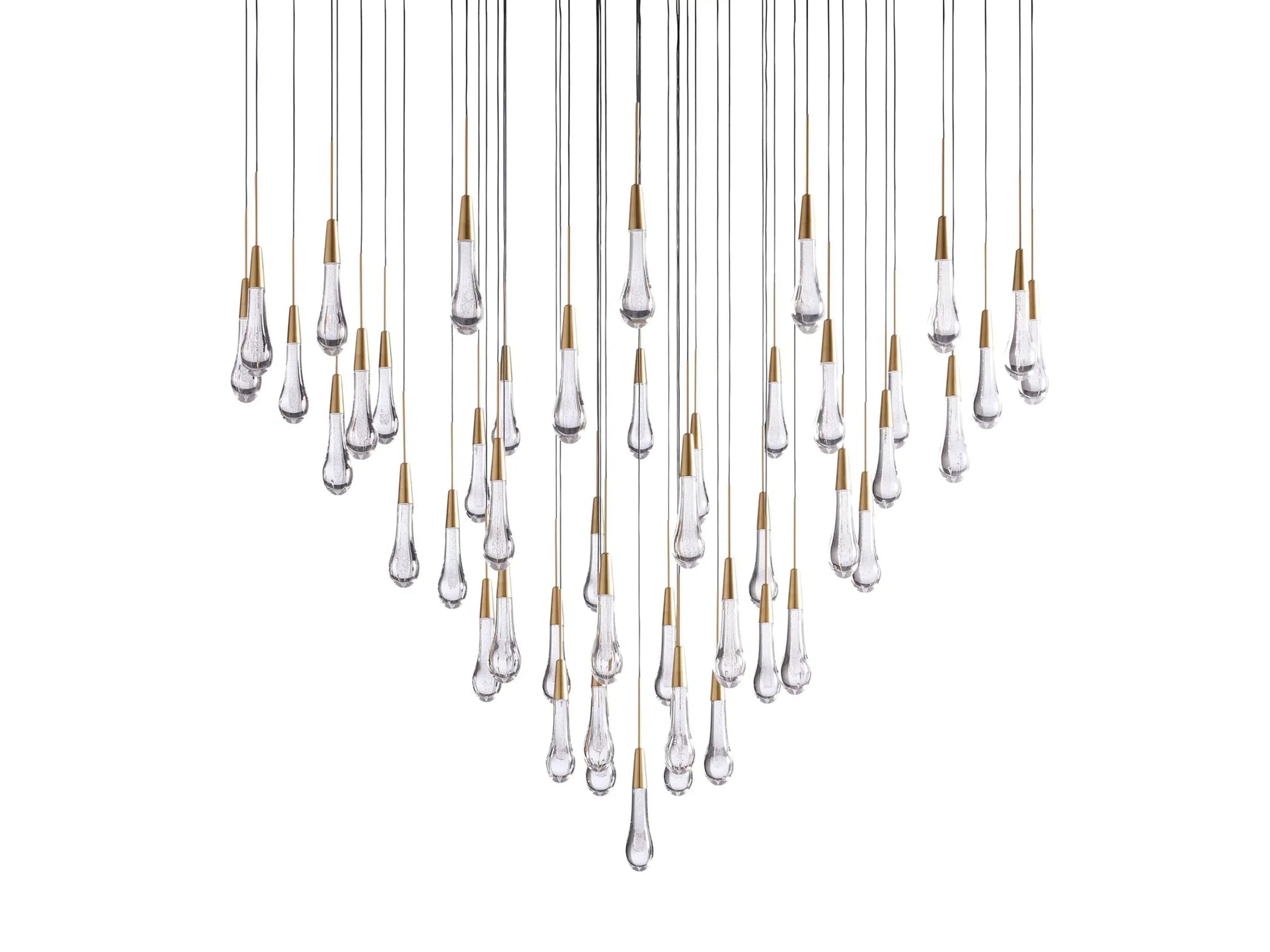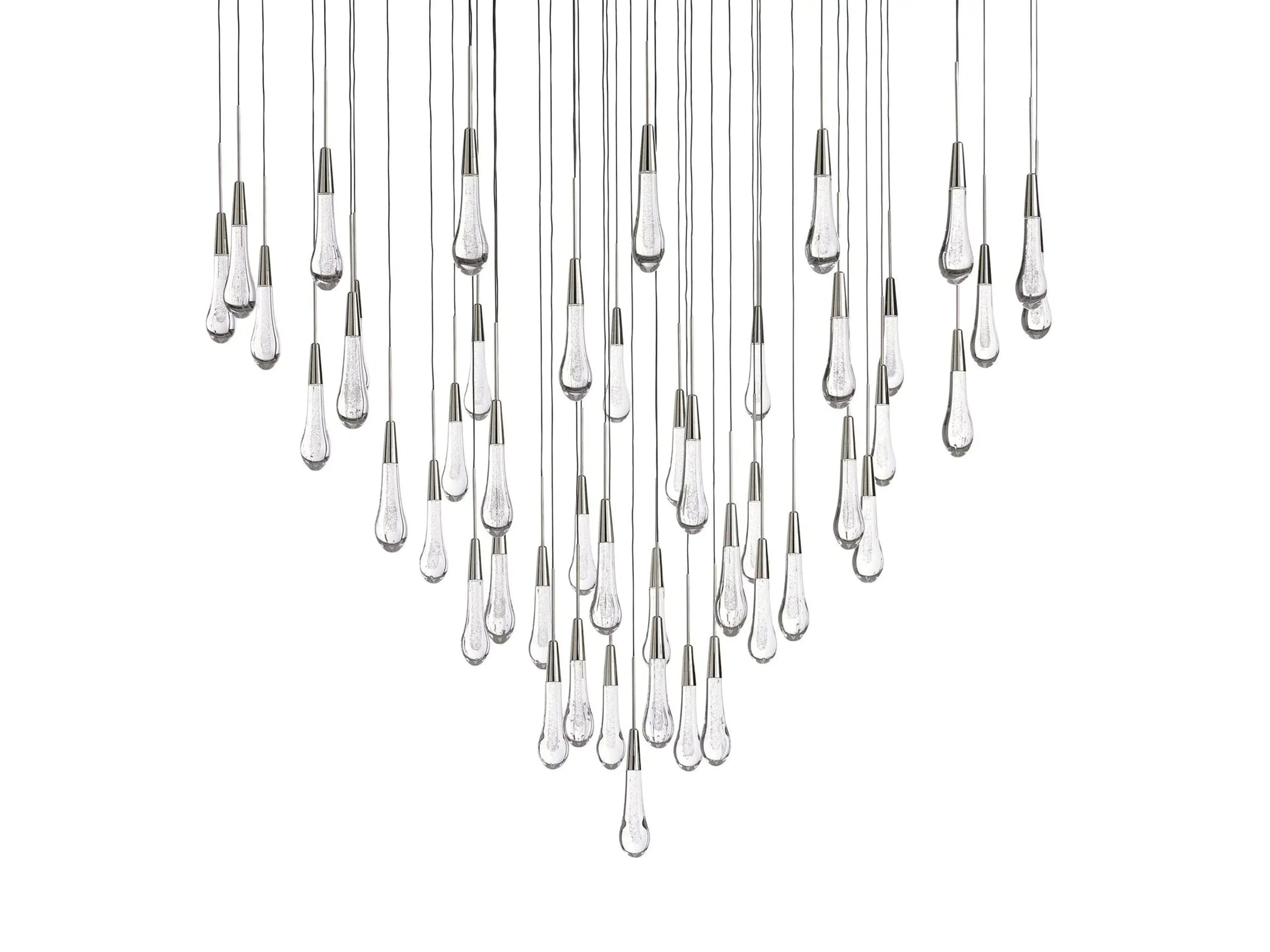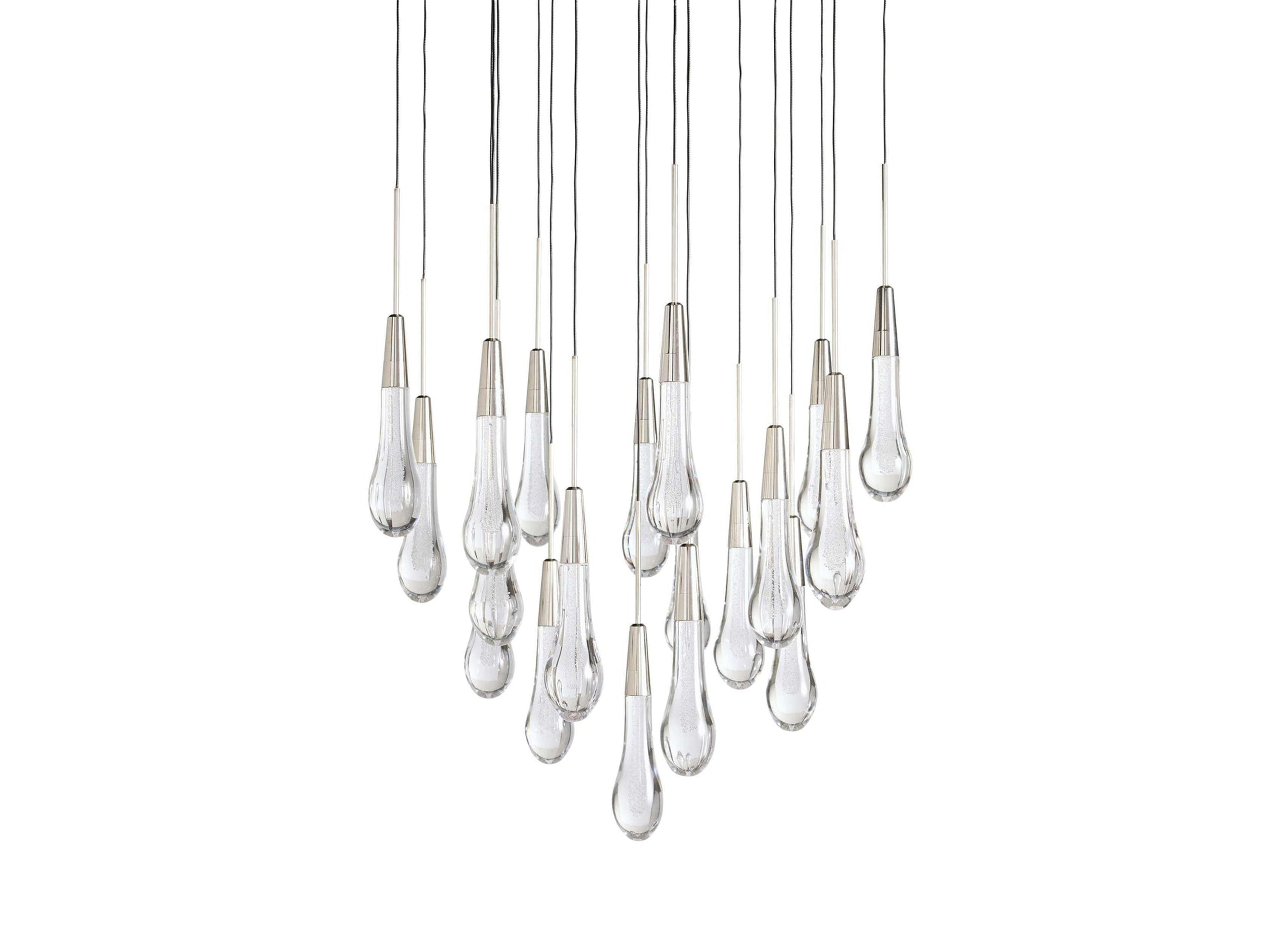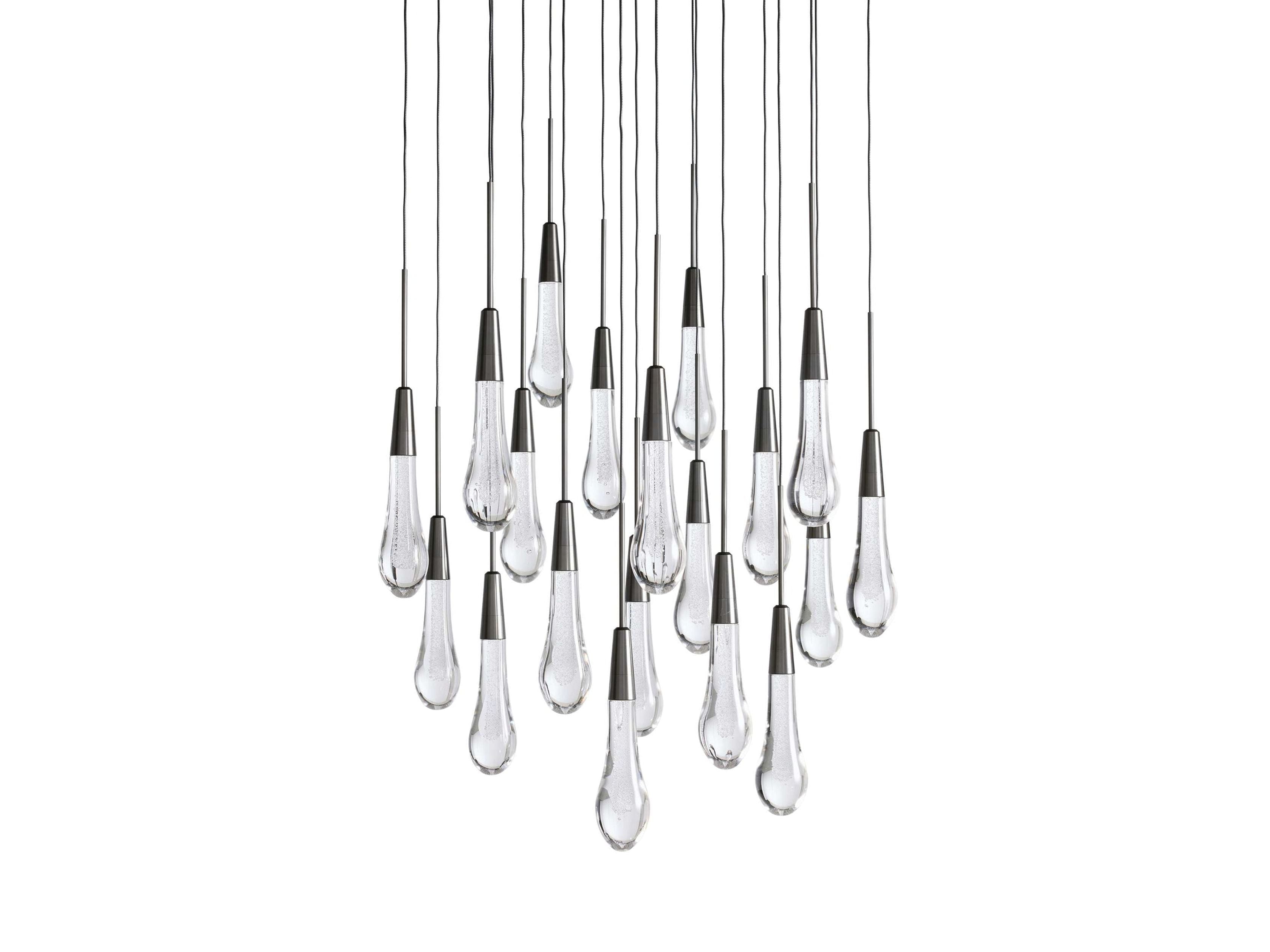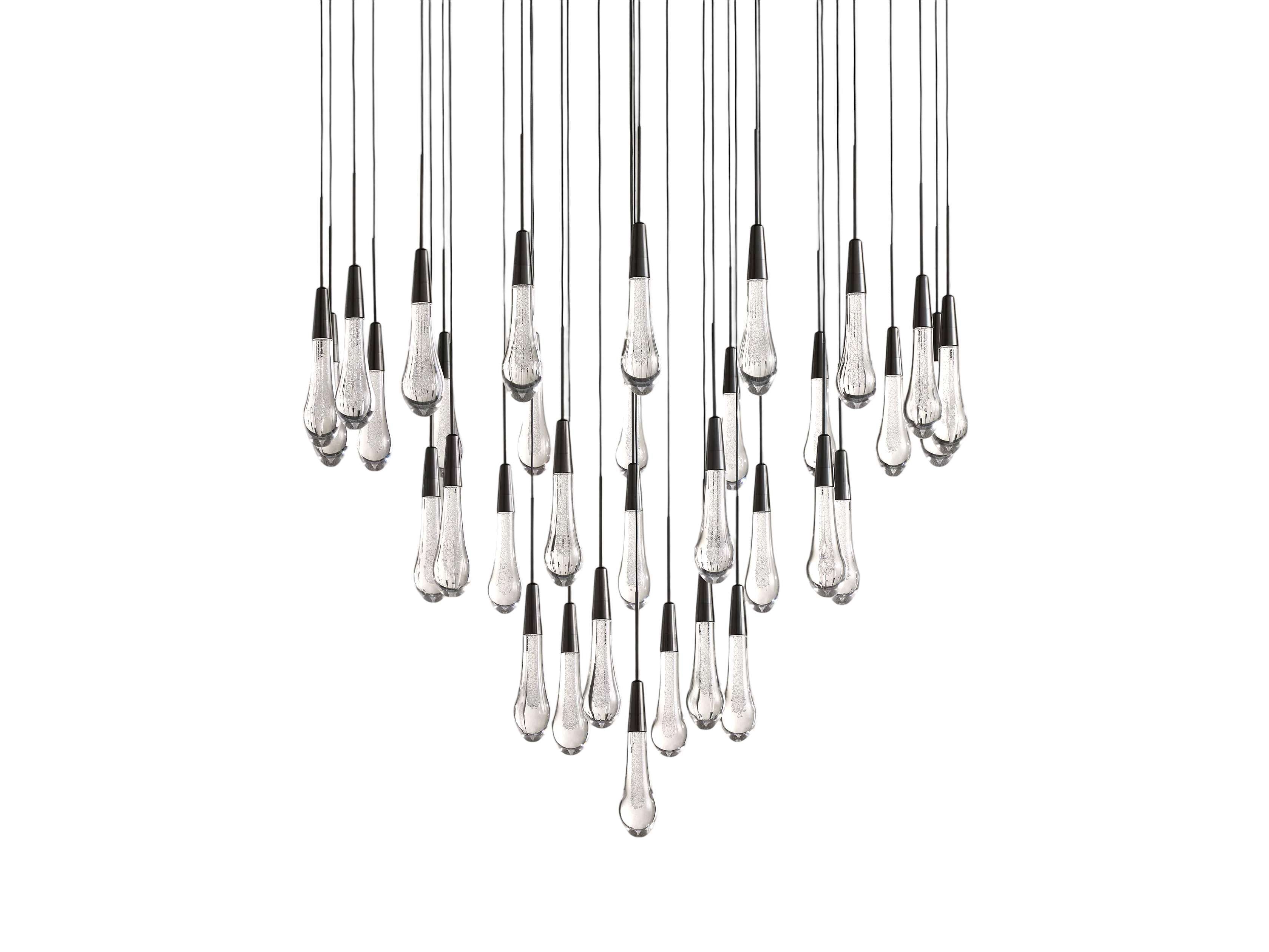 Inspired by falling raindrops, the Soltaire series pairs hand crafted seeded glass pendants with integrated LED light, creating a sculptural glow. Suspended by refined black cords, it forms a modern cascading silhouette built for lasting performance.