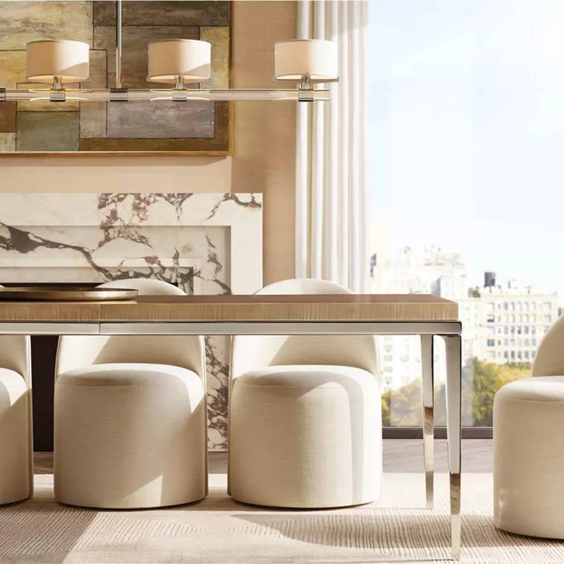 The Truman Collection reflects the purity of mid-century form through crystal arms, linen shades and concealed structure. With every element composed in parallel, the design reveals a refined balance of strength and simplicity.