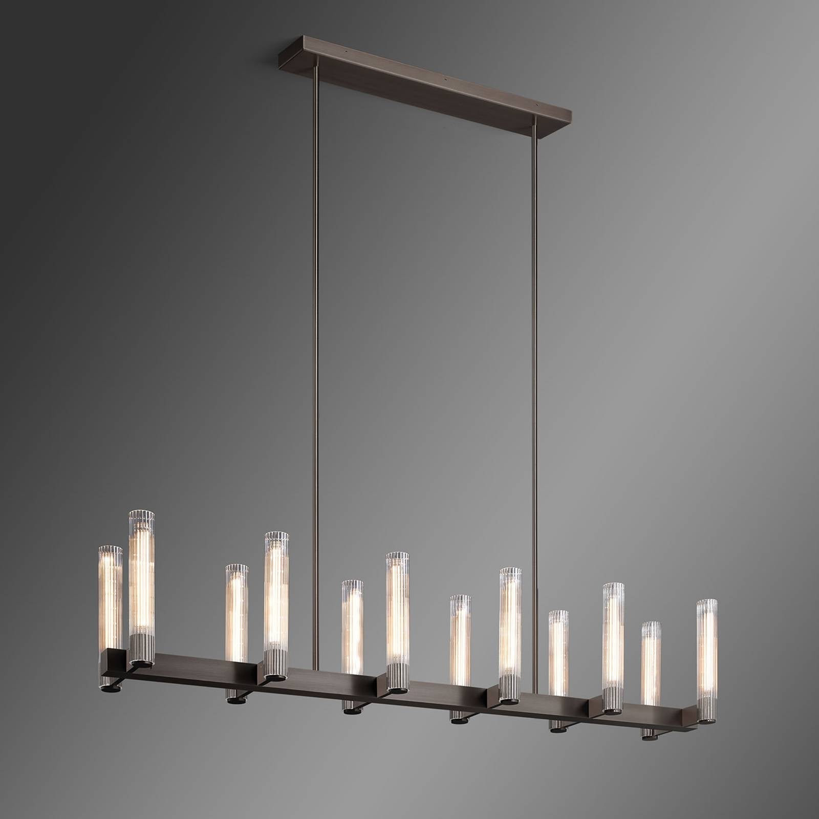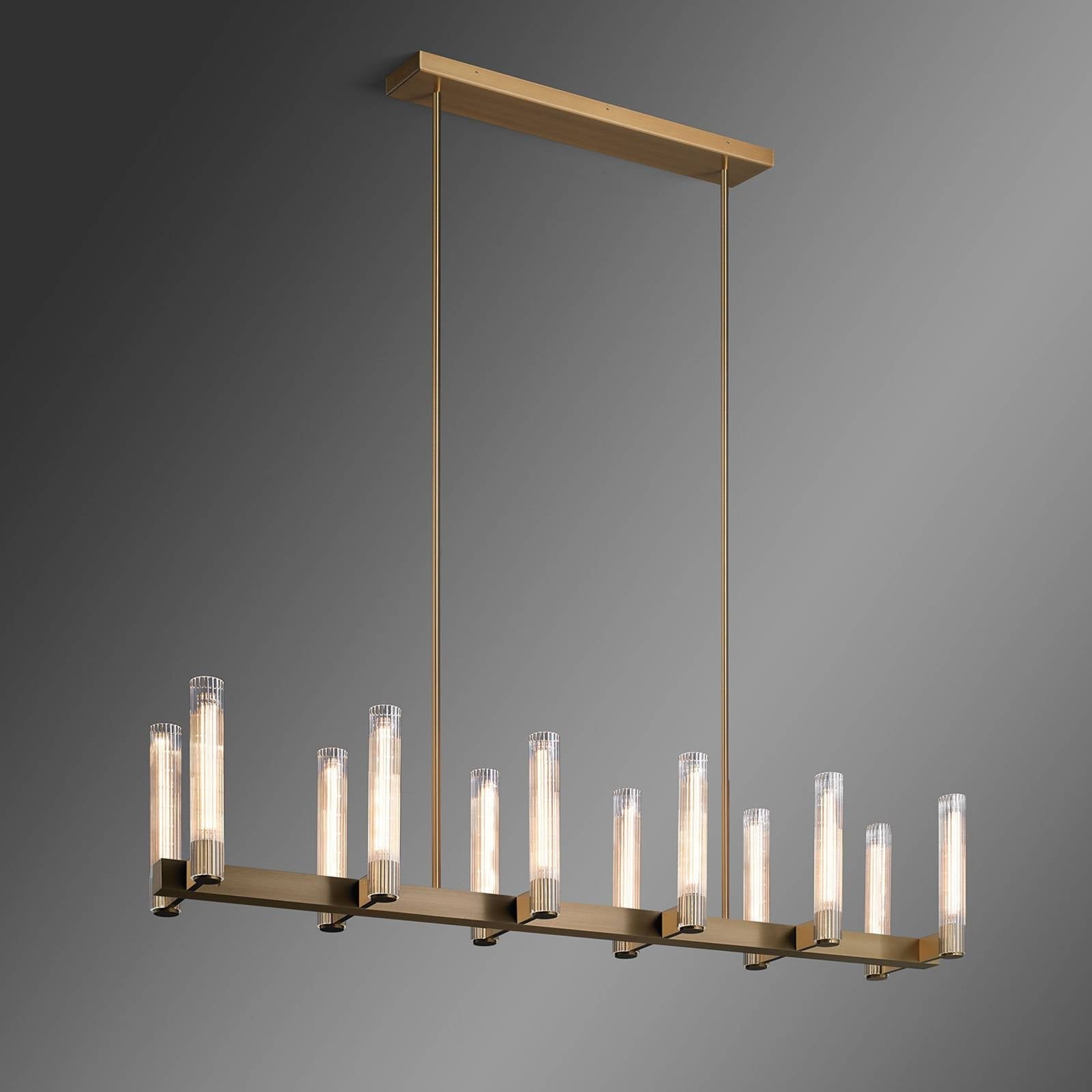 The Vallon Collection distills classical elegance into a geometric brass frame and etched glass shades. Precision-cut forms and warm filament bulbs create a sculptural glow, merging vintage inspiration with modern refinement.