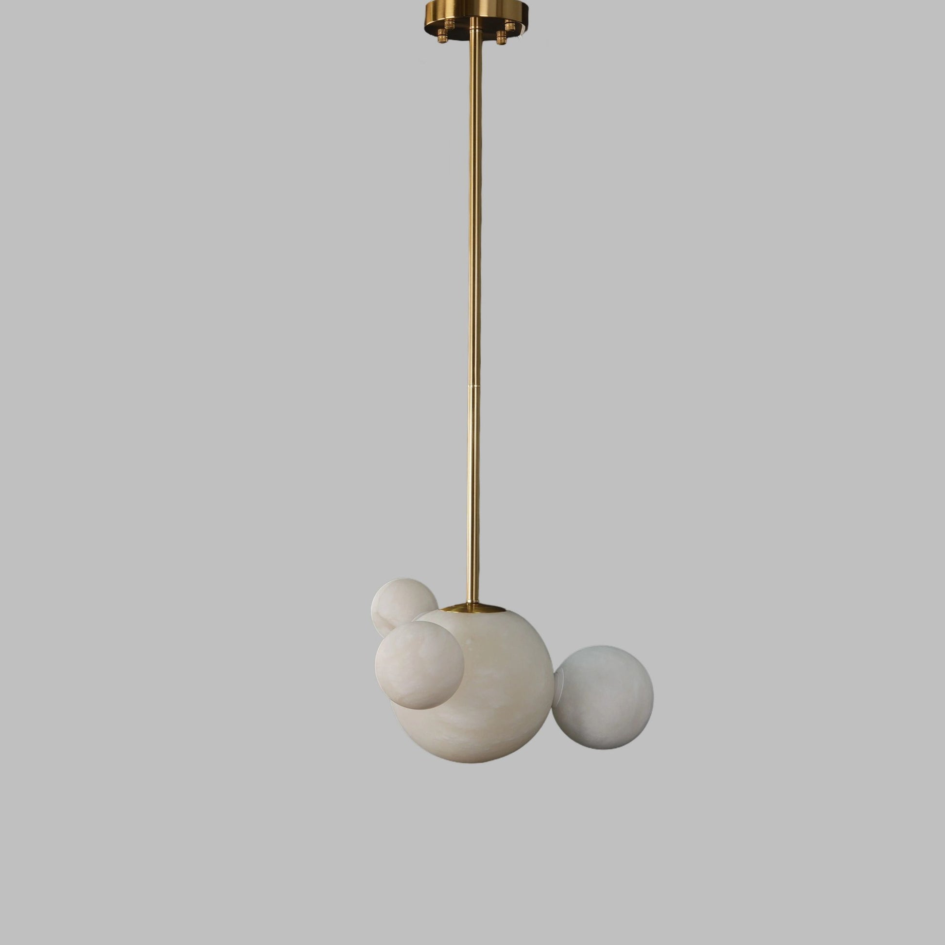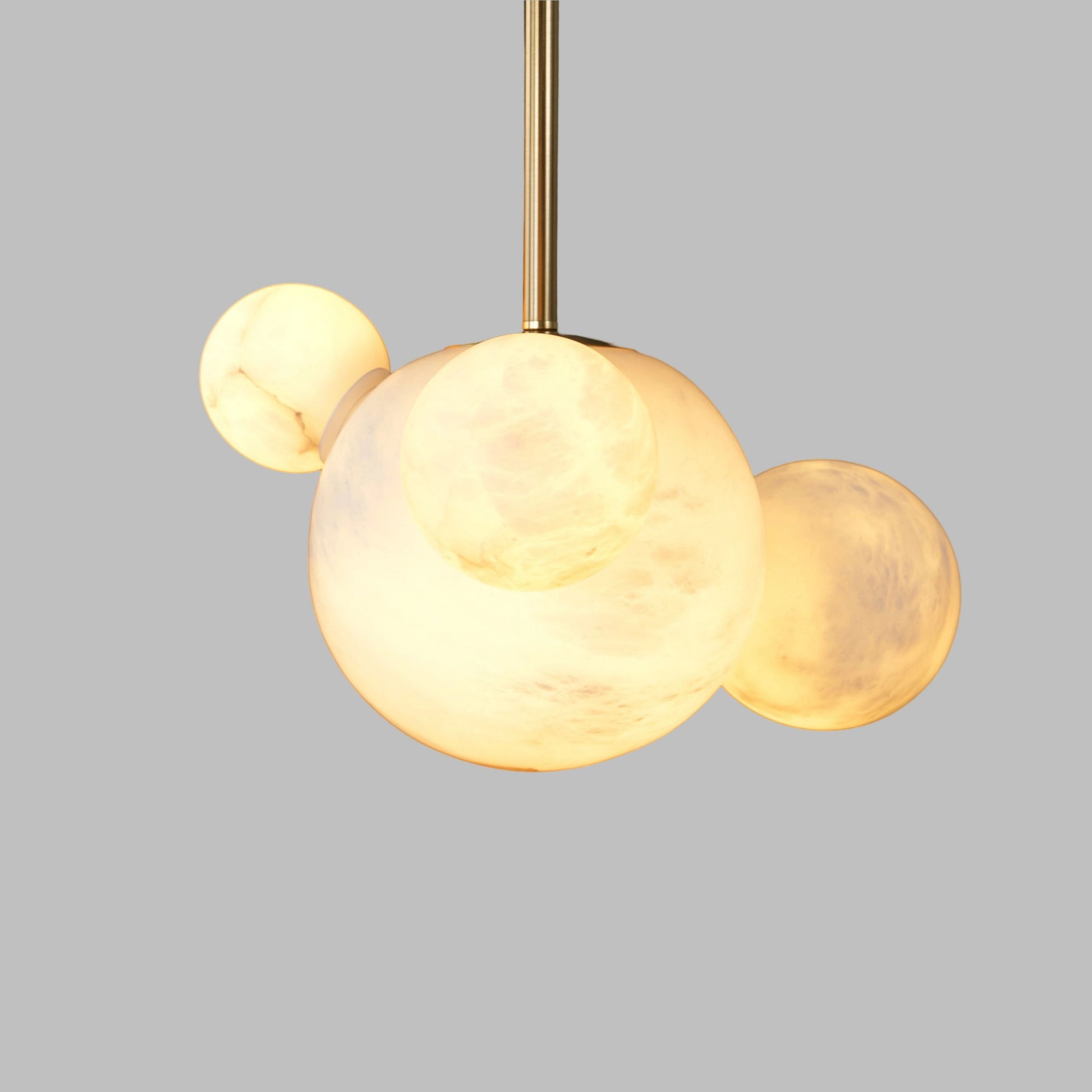Each pendant is made from alabaster, a natural material with unique patterns. The metal components provide structural support and complement the alabaster’s neutral tones.